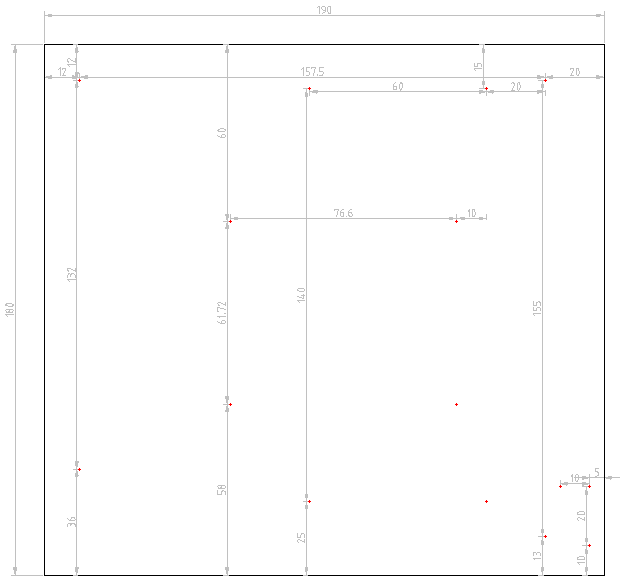 周囲の、横157.5、縦132と155がマザー固定穴。ミリネジのスペーサーをナットで固定する。規格はインチなんで、横6.2インチ、縦5.2インチと6.1インチが正確な穴間隔。